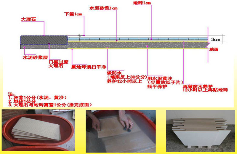 (二)材料配比:灰漿比(水泥\中粗黃砂) 1:2水泥砂漿,鋪貼厚度宜為6~10mm。拌好要醒一醒,用多少拌多少。如:上午拌上午要用完。