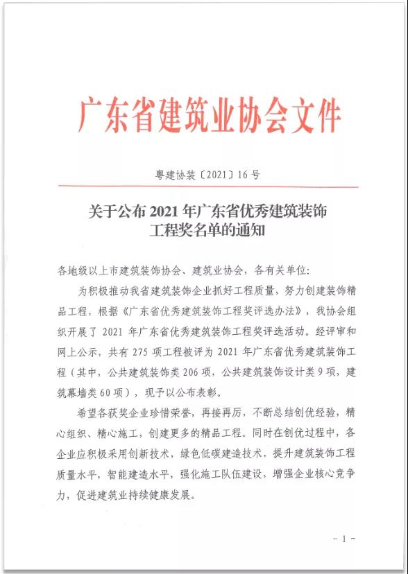 喜訊︱熱烈祝賀新美集團榮獲2021年廣東省優秀建筑裝飾工程獎