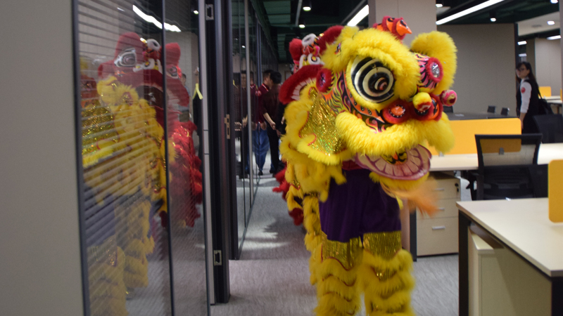 最后的舞獅表演給本次揭牌儀式暨喬遷慶典劃上圓滿(mǎn)句號(hào),到場(chǎng)嘉賓隨后自由參觀新美創(chuàng)意大廈,三五成群,高談嬉笑。