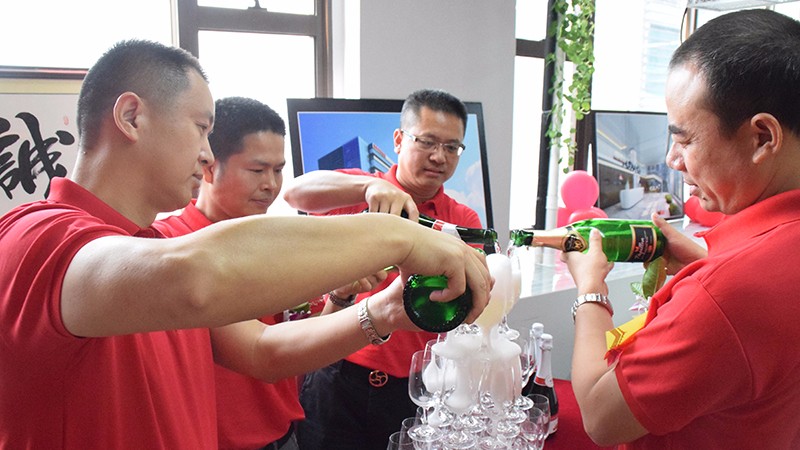 接下來,最精彩的時刻到了。滿滿的香檳環節,人手一杯,慶祝分公司開業大吉。而新美集團副總裁黃鼎華與東莞分公司總經理胡總更是添上了超級大彩頭,立下1500萬的業績軍令狀!